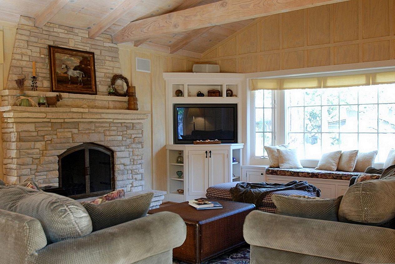 Интерьер комнаты с угловым камином и телевизором