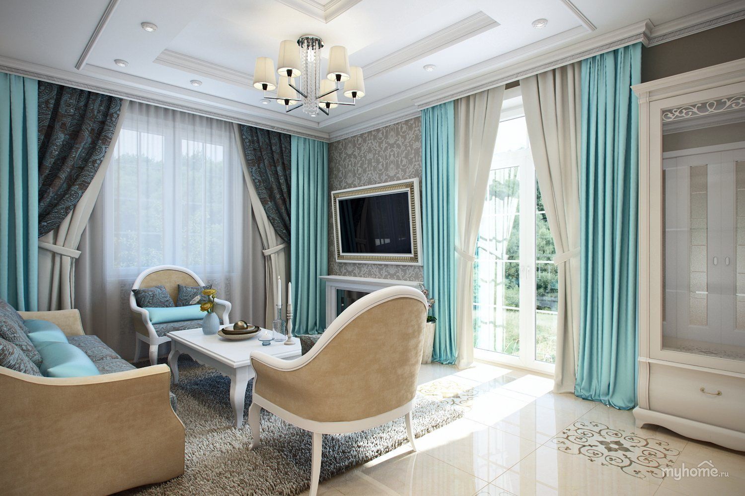 Бирюзовые бежевые шторы в интерьере