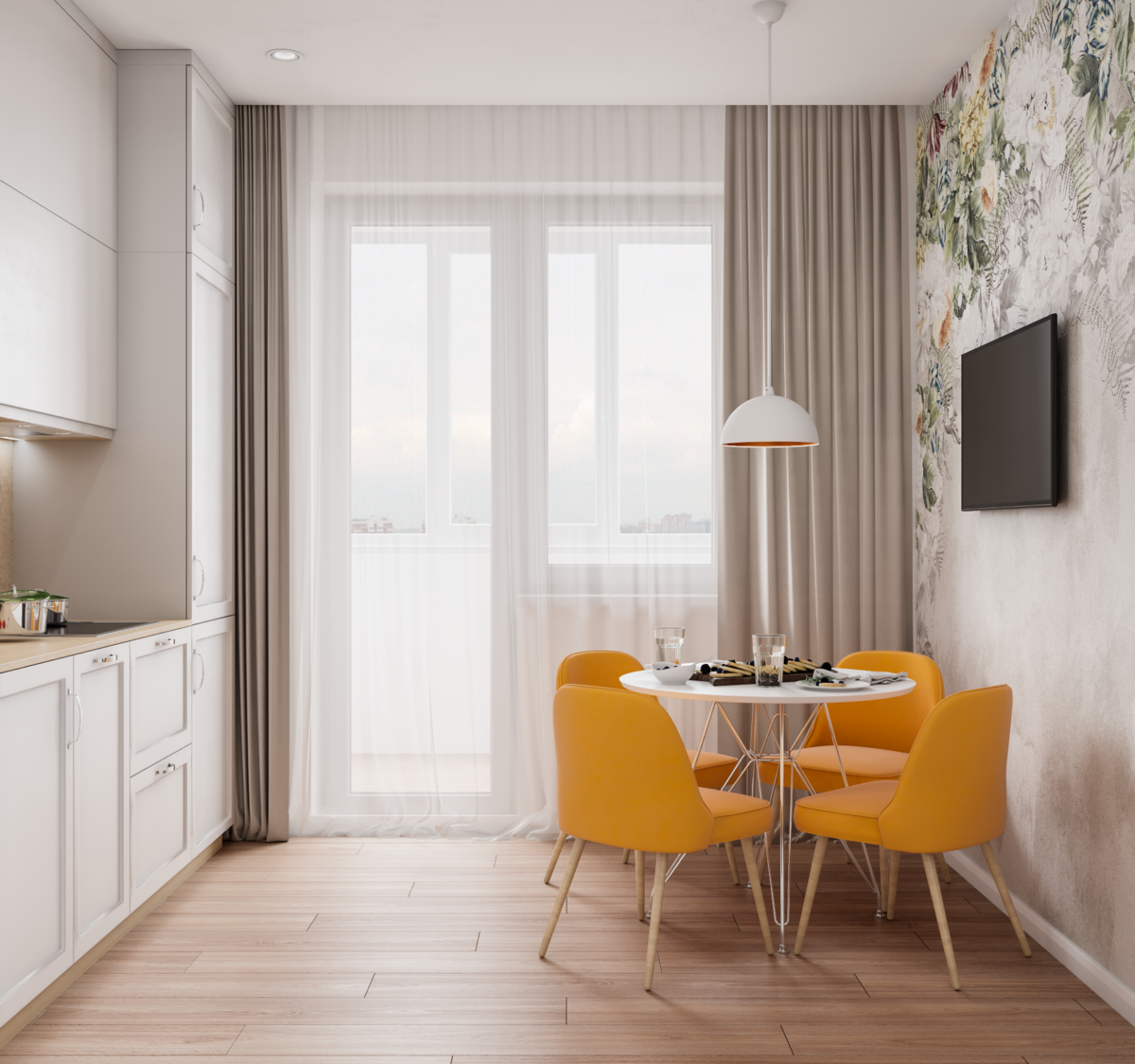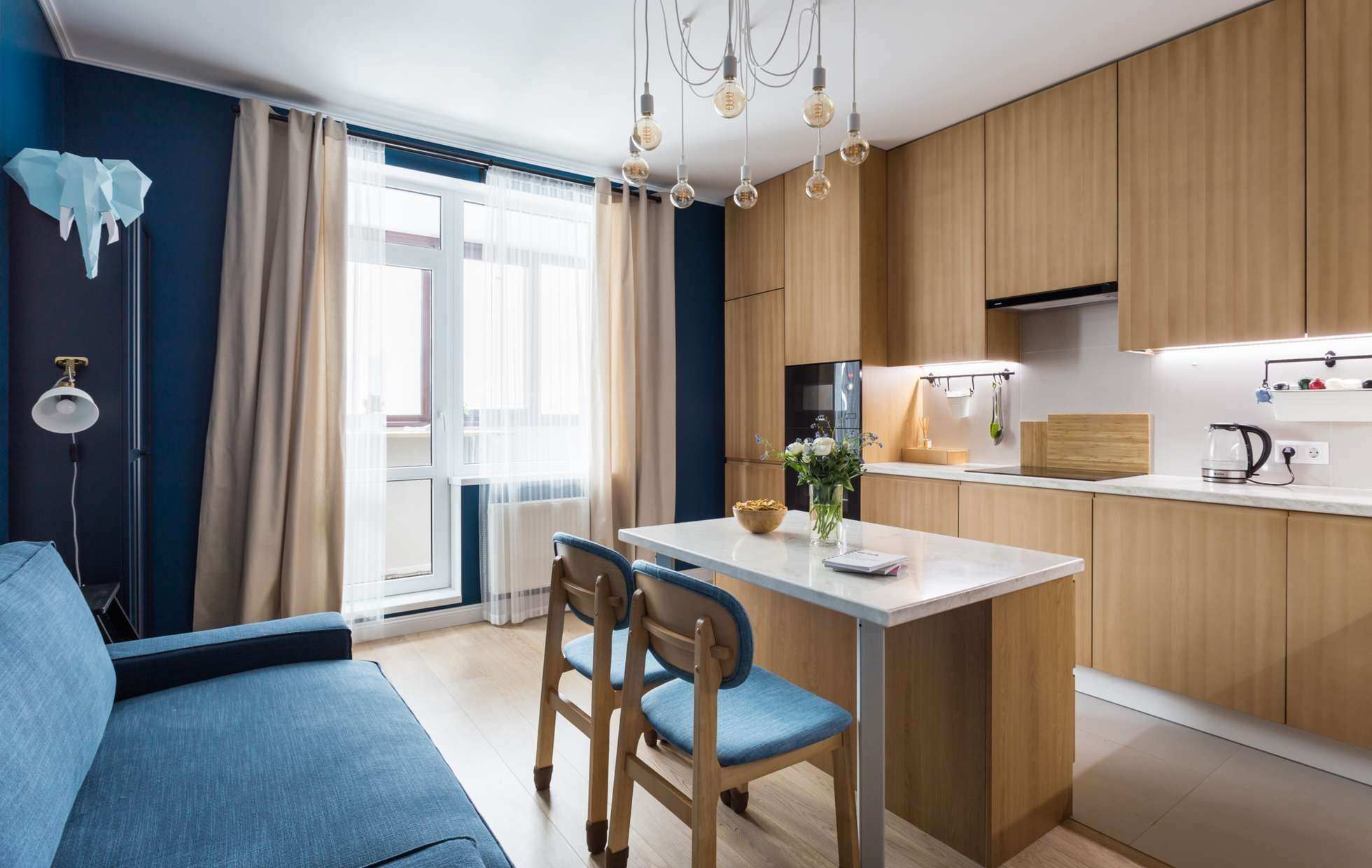 Интерьер кухня гостиная с балконной дверью